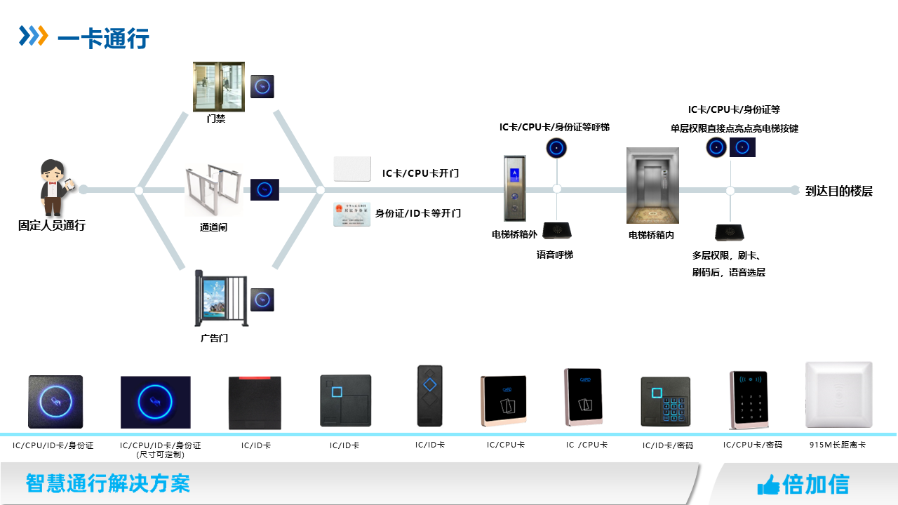 在住宅、寫(xiě)字樓、酒店、醫(yī)院、學(xué)校等場(chǎng)景,實(shí)現(xiàn)一次授權(quán)發(fā)卡,可以通行所有門禁、閘機(jī)、電梯等設(shè)備。設(shè)備可脫機(jī)、可聯(lián)網(wǎng),施工維保簡(jiǎn)單。